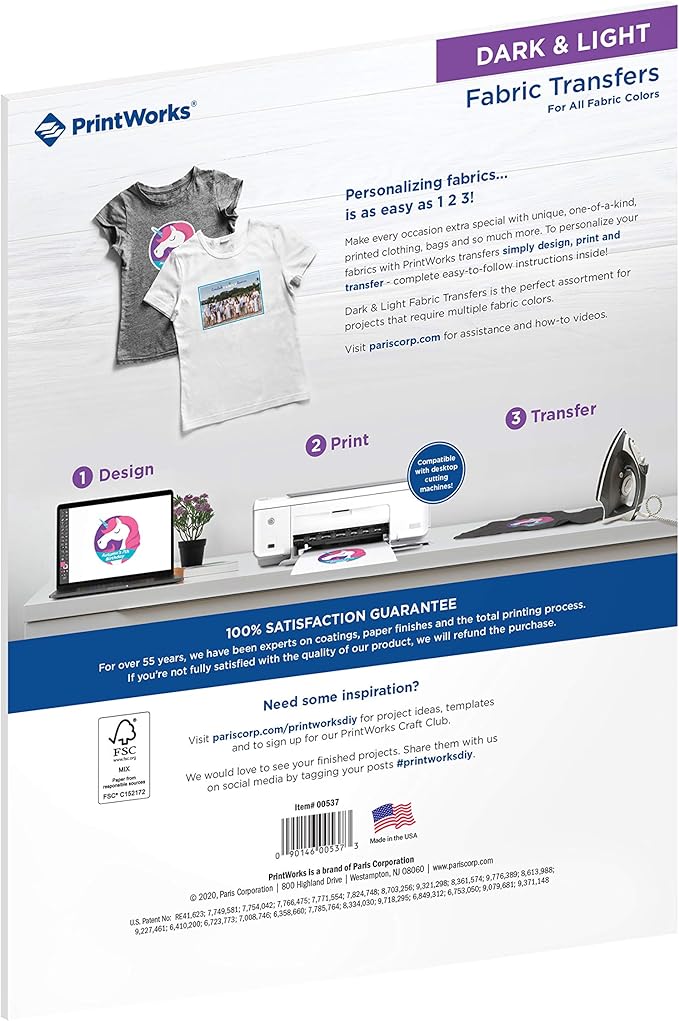 PrintWorks Printable Iron on Heat Transfer Paper for Dark & Light Fabrics & T-Shirts, 8.5” x 11”, 10 Sheets, Made in the USA