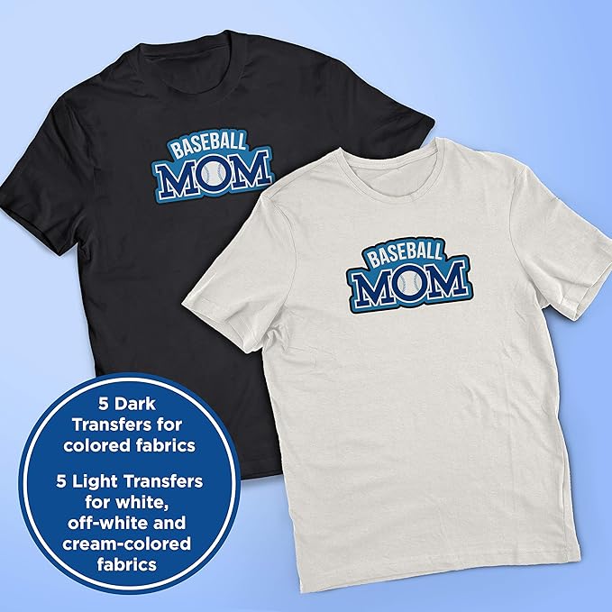 - VERSATILE: Variety pack of 5 dark fabric transfers and 5 light fabric transfers that allows you to transfer custom designs and photos onto t-shirts, hoodies, bags, hats, and sneakers of all colors