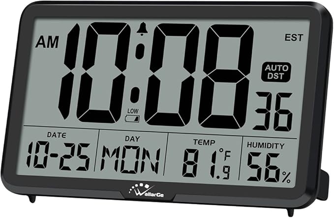 WallarGe Auto Set Digital Wall Clock Battery Operated, Desk Clocks with Temperature, Humidity and Date, Large Display Digital Calendar Alarm Clock for Elderly, Bedroom, Office, 8 Time Zone, Auto DST.