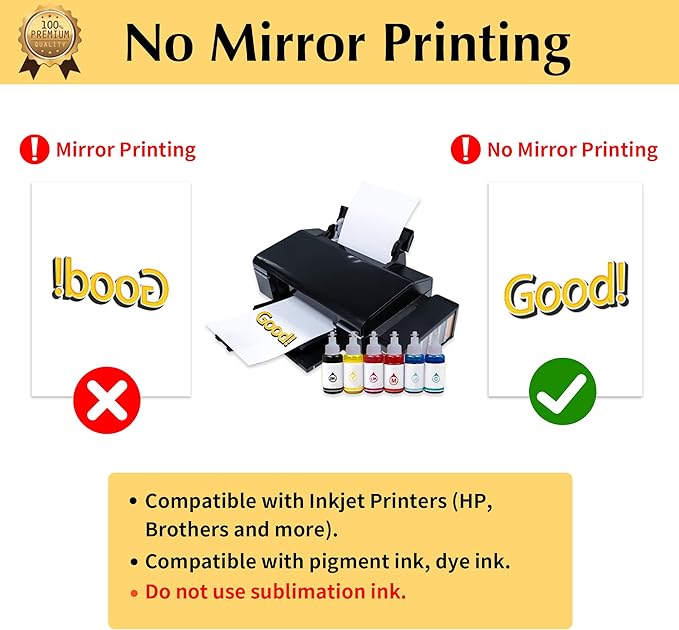 - 💕REQUIREMENTS: Inkjet Printers (such as HP, Brother and other brands)--Pigment Ink or Dye Ink (Do NOT use Sublimation ink) --Scissors or Cutting Machine--Iron or Heat Press machine--Teflon Paper (included in the pack).