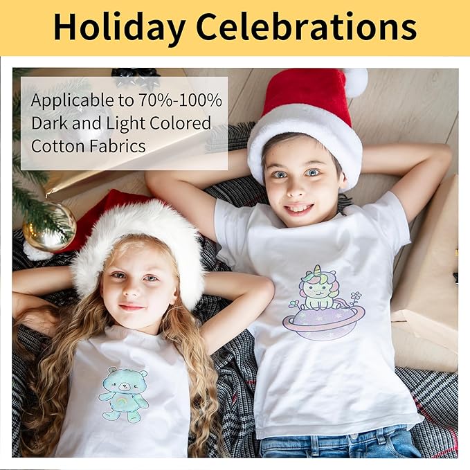 - 💕Applications: Transfer text, images, photos and pictures onto both light and dark colored cotton fabrics, such as sweatshirts, hoodies, totes, canvas bags, aprons, masks, pillow cases, cushion covers, tablecloths, and flags.100% cotton fabrics are recommended. For poly blend cotton or other fabrics, please do a test first. Make custom DIY gifts to your friends or your family on Mother's Day, Father's Day, Birthday, Thanksgiving, Easter, Halloween, Christmas, Valentine's Day or Wedding Day.