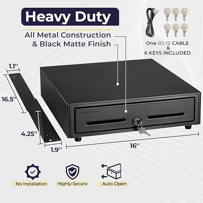 - DURABLE POS CASH DRAWER: Volcora cash register drawer measures 16”x16”x4”(approx. 4.5 including rubber legs), voltage is at 24 VDC and comes with a micro switch. Our money drawer has a heavy-duty durable metal frame that is an ideal cash register for small businesses and even big establishments too.