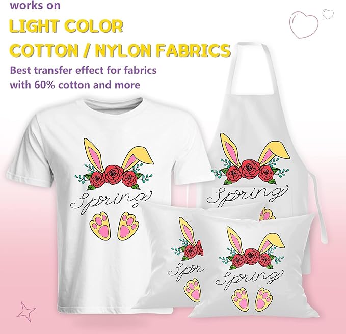 - Wide Application: This iron-on transfer paper is designed for light-colored cotton fabrics. With the help of this fabric transfer paper, you can easily customize T-shirts, tote bags, pillows, aprons and more. Why not making some lovely gifts to your families or friends with our tshirt transfer paper