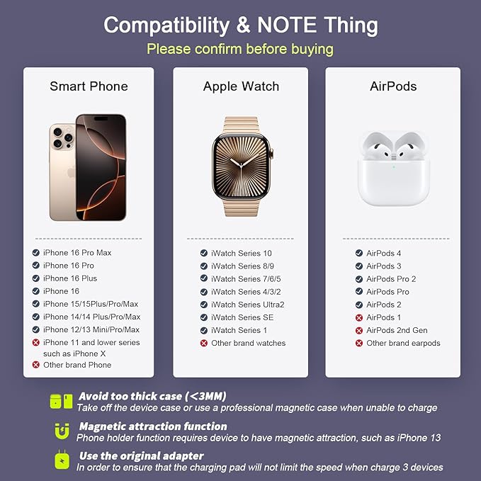 - Compatible Phone Models : iPhone 16, iPhone 16 Plus, iPhone 16 Pro, iPhone 16 Pro Max, iPhone 15, iPhone 15 Plus, iPhone 15 Pro, iPhone 15 Pro Max, Phone 14, iPhone 14 Plus, iPhone 14 Pro, iPhone 14 Pro Max, iPhone 13 mini, iPhone 13, iPhone 13 Pro, iPhone 13 Pro Max, iPhone 12 mini, iPhone 12, iPhone 12 Pro, iPhone 12 Pro Max, AirPods 2/3/4/Pro, IWatch 2/3/4/5/6/SE/7/8/9/10(Compatible with MagSafe cases) Note: Do not compatible for Samsung Galaxy, Android model iPhone 16, iPhone 16 Plus, iPhone 16 Pro, iPhone 16 Pro Max, iPhone 15, iPhone 15 Plus, iPhone 15 Pro, iPhone 15 Pro Max, Phone 14, iPhone 14 Plus, iPhone 14 Pro, iPho… See more