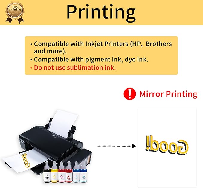 - 💕Requirements: Inkjet Printers (HP, Brother and more) | Pigment Ink or Dye Ink | Scissors | Household Iron or Heat Press machine