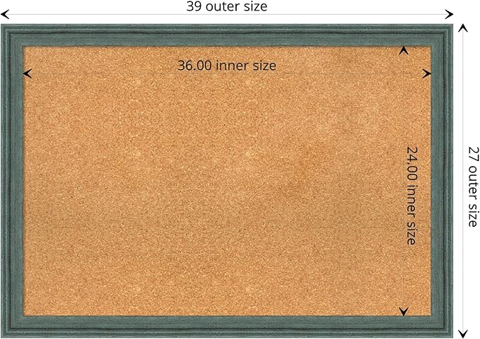 - DIMENSIONS: The overall size of this framed corkboard measures 39 in. x 27 in., including the frame. Its functional cork board area measures 36 in. x 24 in.