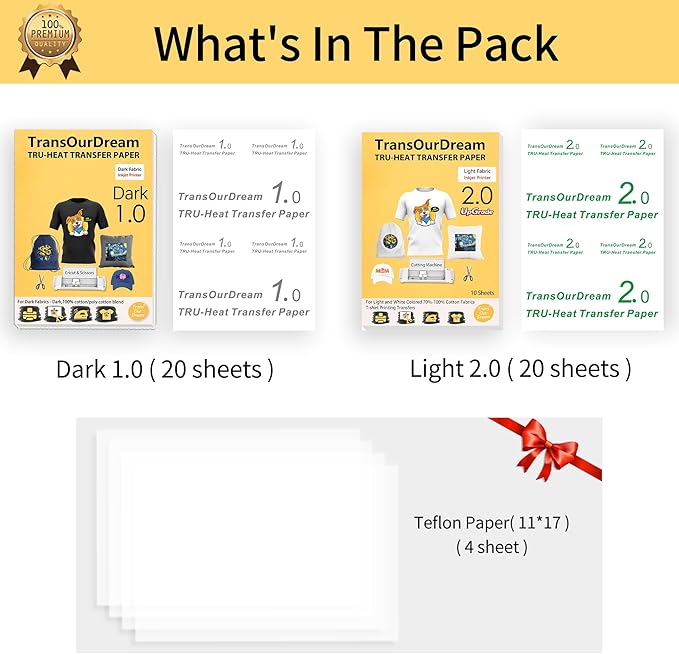 - 💕TRU-TRANSFER PAPER: Pack of 20 sheets Dark 1.0 heat transfer paper, 20 sheets Light 2.0 heat transfer paper and 4 sheets reusable teflon paper. Our dark iron-on transfer paper is produced with waterborne polyurethane by AI edge technology, allowing transfers stretchable and non-breakable up to 2X its original size, especially easy to cut with scissors or die cutting machine. Our advanced and unique formula guarantees the transfers vibrant, soft and machine washable.