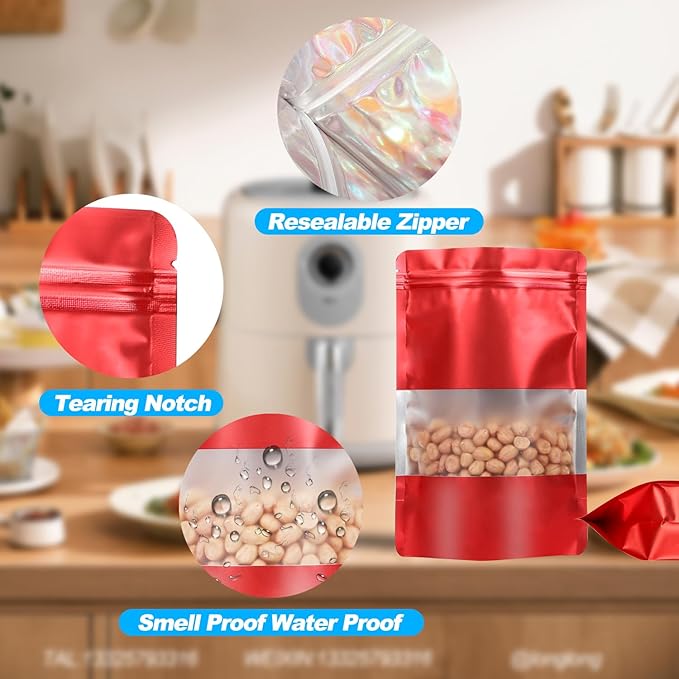 - 【Thoughtful Design】The corners of the bag are rounded to avoid scratching the skin during use.The matte window in the center allows you to see what's in the bag without opening the closure.Vertical design makes it easier to place the food bag on the table.