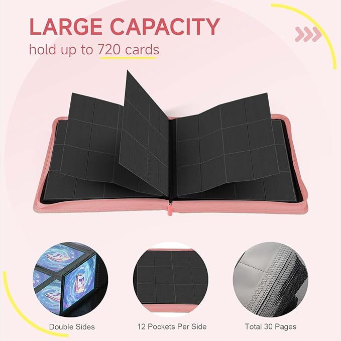 Trading Card Binder with Zip,12 Pockets Card Binder,720 Double Sided Pocket Card Collection Binder,Card Album Card Folder for MTG,TCG,Sports Cards,Game Cards,Pink