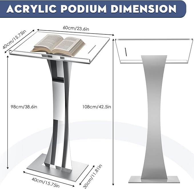 - ELABORATE SIZE - Our Podium Stand is made of 10mm thickened acrylic panel for extra load bearing capacity up to 66 lbs, measuring 44.9''H x 23.6''L x 15.7''W inches, with a table top measuring 23.6''L x 15.7''W for bibles, flowers, laptops, decorative or desired items