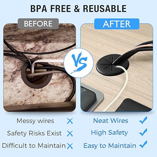 - Maintain Safety: The desk wire hole insert helps to organize cables on your desktop, keeping it tidy and improving productivity; Cable grommet smooth surface protects cables from sharp edges, reduces bending and pulling of cables, extends cable life and ensures a safe work area