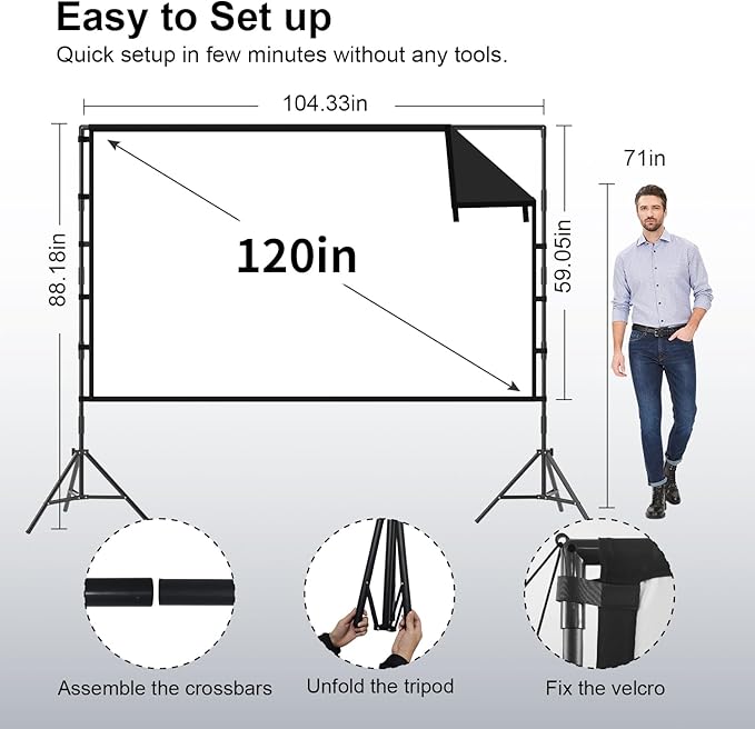 - Easy to Set Up: Outdoor projector screen includes a user-friendly instruction manual for effortless setup in just a few steps. Its detachable crossbar requires no tools for assembly, and the tripod opens swiftly for instant use. Designed for outdoor durability, the projector screen outdoor equipped with grounding spikes, windproof ropes, and sandbags to ensure stability even in windy conditions.