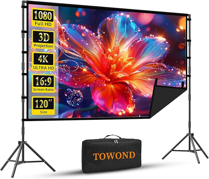 Outdoor Projector Screen with Stand, TOWOND 120 inch Portable Projector Screen Black Backing, Indoor Projection Screen 16:9 4K HD Wrinkle-Free Movie Screen with Carry Bag for Backyard Movie Night