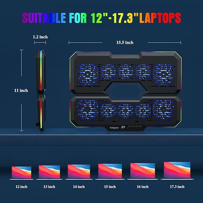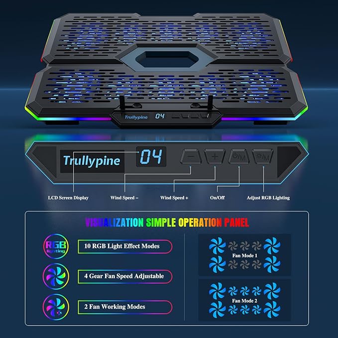 - 【10 Dual High-Speed Cooling Fans & Phone Stand】Trullypine laptop cooling pad can effectively cool down your laptop with 4 large cooling fans and 6 small cooling fans. The fan switch and the wind intensity of the fans can be controlled by buttons of 5 speed settings. It is an ideal companion for long gaming sessions or video editing, Effectively prevent overheating and lag. It also comes with a phone stand with 4 adjustable angles.