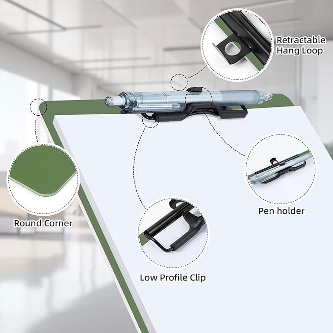 - Retractable Hanging Ring: The hanging clipboard has a retractable hanging ring on the top for easy access, you can hang it up to display the contents of your clipboard or hang it on the wall when not in use to save storage space. The low profile clip is ideal for stacked storage.